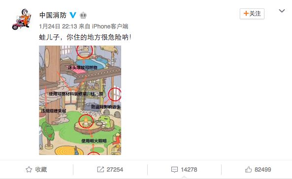 直到有一天,1月24日,公安部消防局的官方微博@中国消防说出了真相:蛙的家很危险!