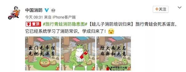 今天,公安部消防局又发微博,称旅行青蛙会死系谣言,它已经系统学习了消防常识,学成归来了!